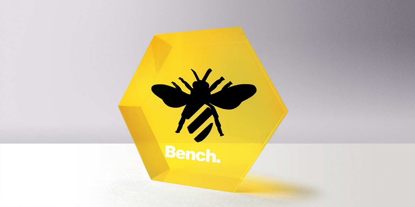 We were asked by Bench to create a Point Of Sale piece that can be used by their stores and retail partners to promote their brand heritage. The bee identity celebrates the company’s Manchester roots as the bee is often used within the city to represent its enterprising spirit. The process went through several iterations before we settled on the final design which we then had prototyped, tested and machined. The overall result was a beautifully crafted object with great presence within the store environment.