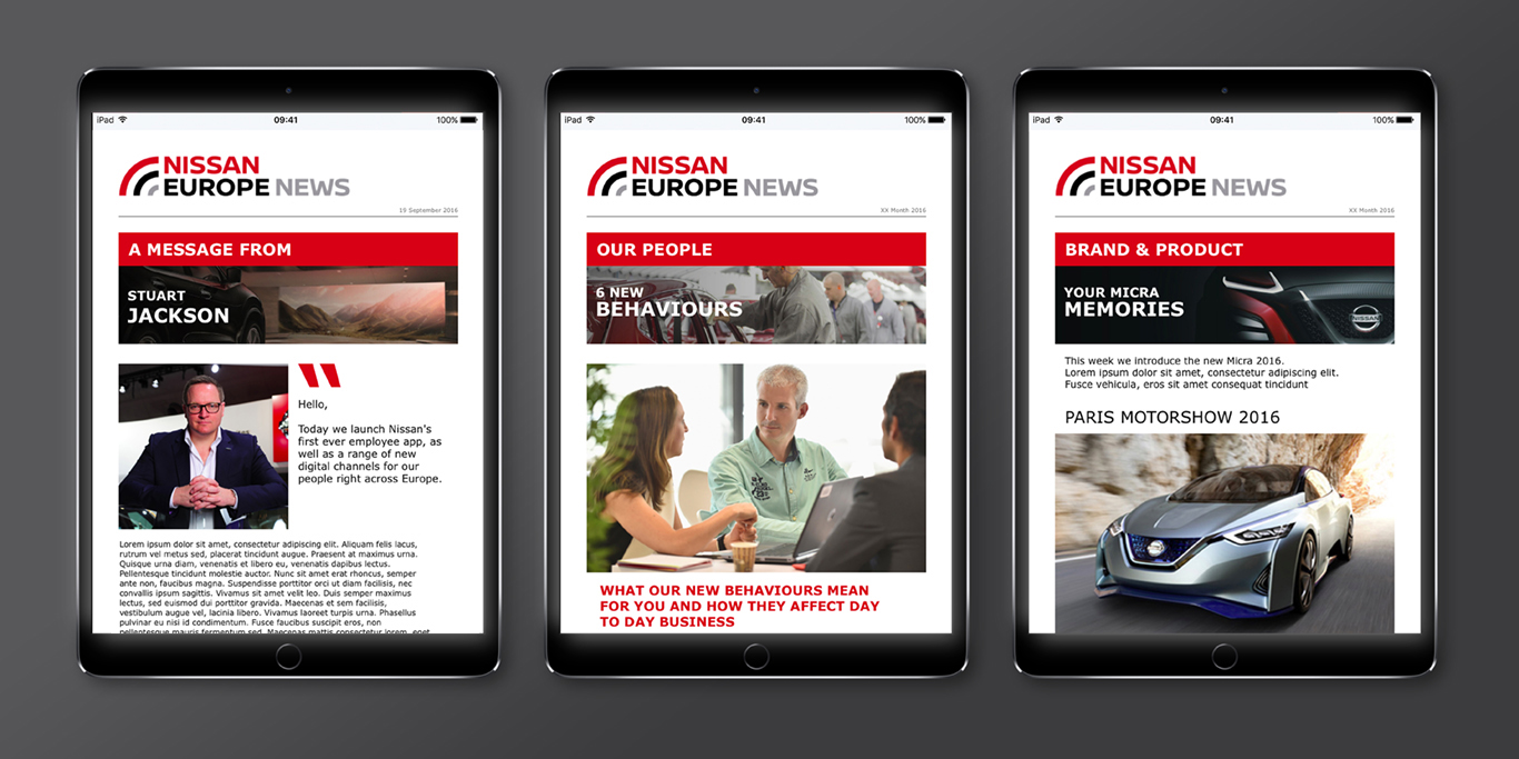 Nissan gave us the task to develop and supply a flexible email template format to be used in all their internal communications dispatches. It would be used across the whole Nissan Europe Group suppling everyone with the latest information and news from Nissan. We focused on creating the look and feel of a premium editorial title and drew inspiration from a wide range of news apps and feeds. Providing a clean ‘look and feel’ without becoming over designed. We supplied user-friendly templates for both local and international teams.